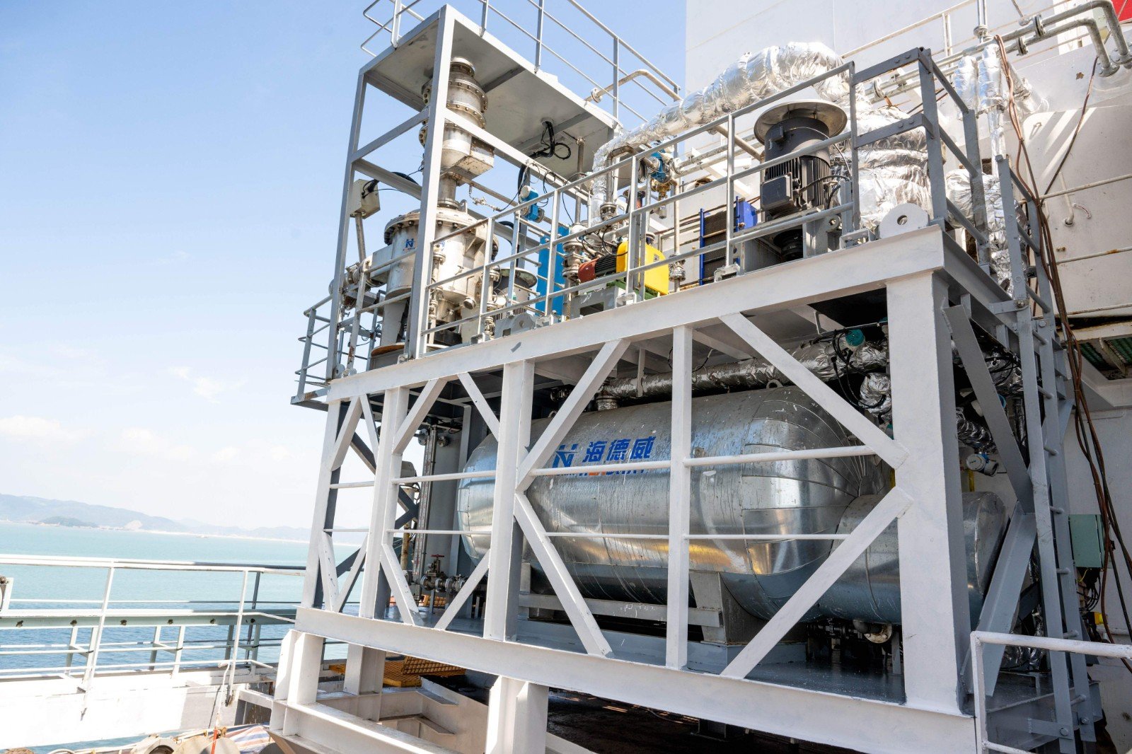 海洋衛(wèi)士?船載碳捕集系統(tǒng)依托海德威自主設(shè)計(jì)的高速離心脫碳技術(shù)和高性能吸收劑,以高速旋轉(zhuǎn)形成的離心力場(chǎng)替代傳統(tǒng)重力場(chǎng),顯著提升了氣液兩相傳質(zhì)效率,系統(tǒng)脫碳效率超過(guò)90%,二氧化碳捕集純度可達(dá)99.6%以上,具有脫碳效率高、體積小、能耗低、安裝及儲(chǔ)運(yùn)便捷等優(yōu)勢(shì)。